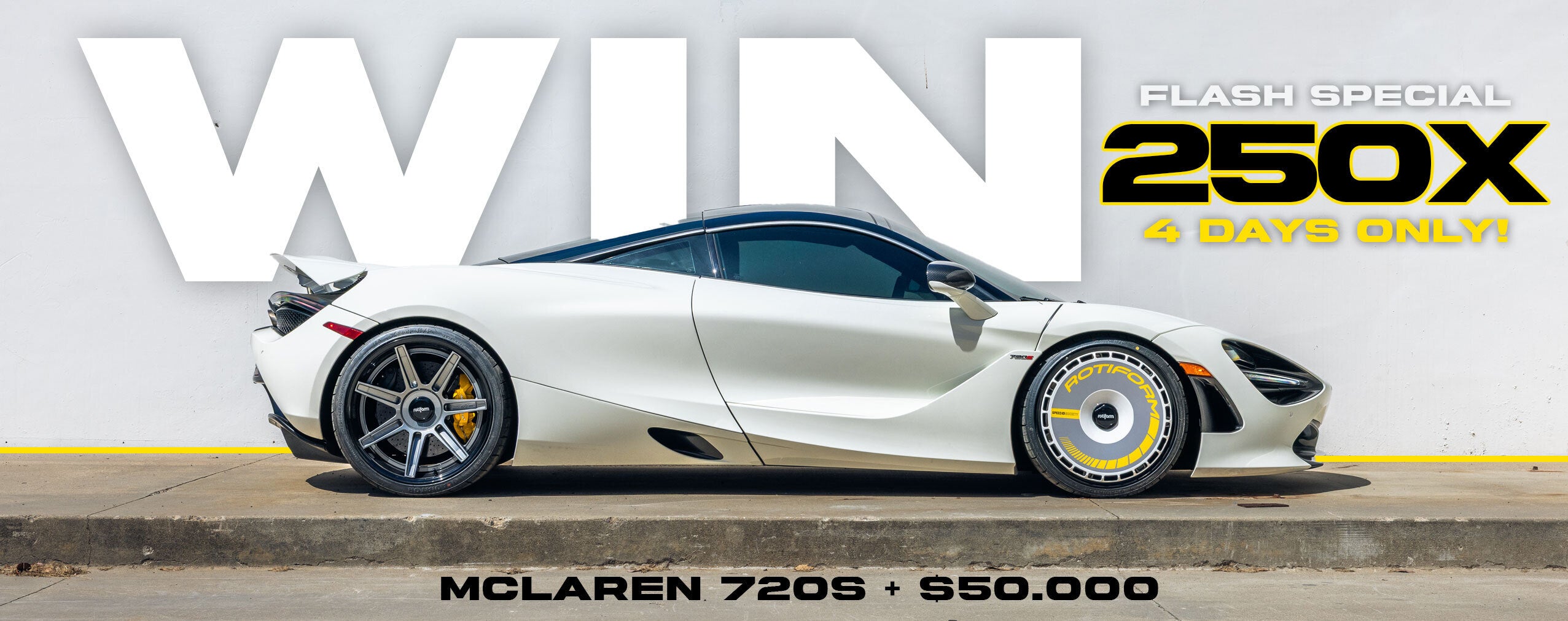 Introducing our latest masterpiece here at Speed Society, #SSG45 - the McLaren 720S “Rotiform Edition”, is our 54th premium giveaway car. It’s an automotive legend in its own right! The McLaren 720S is already a benchmark supercar, but this build takes it even further. This Silica White beauty boasts exclusivity, elegance, and raw power. With a heart-pounding 4.0L Twin-Turbo V8 under the hood, unleashing 900 horsepower, it rockets from 0 to 60 mph in less than 2.8 seconds. This isn’t just one of the best supercars; it’s the definition of exotic dominance, thanks to the one-of-one 3-Piece Rotiform wheels and polarizing AeroDiscs explicitly designed for this giveaway car.