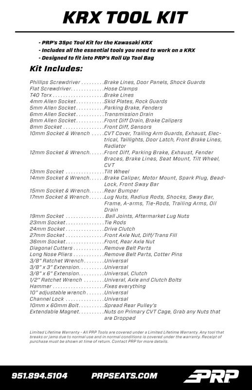 PRP's Kawasaki KRX Roll-Up Tool Kit provides everything you need to fix your Kawasaki Teryx KRX or KRX4 out on the trail. This 35 piece kit includes a selection of high-quality ratchets, sockets, wrenches, extension bars, pliers, and a ball peen hammer (for when things get really fun). We've hand picked the exact tools that are needed most when working on a KRX - So you have only the essentials that you really need, without adding the extra weight of an entire tool box. Below we have listed all the tools included, along with a handy guide to the most common uses for each tool. Each tool also includes a Limited Lifetime Warranty. The Roll-Up Bag makes it easy to keep everything neat and organized. It features dedicated sleeves for all the tools included in the kit, as well as a zippered pocket to hold the sockets and any other tools you want to bring with you. The bag is made from extremely durable twill material. It features heavy duty buckles, and an easy to carry grab handle. It can be mounted, or stored securely inside the vehicle. The roll-up style bag makes it quick and easy to grab out of the vehicle when you need it, and the tools inside don't make noise when bouncing around the trails. Don't get caught out on the trail unprepared. PRP's Roll-Up Tool Kit has everything you need to get your Kawasaki Teryx KRX going! Fitment: Kawasaki Teryx KRX & Kawasaki Teryx KRX4 KIT INCLUDES: ALLEN Sockets 4mmx3/8 - Skid plate, rock guards 5mmx3/8 - Parking brake, fenders 6mmx3/8 - Transmission drain 8mmx3/8 - Front diff drain, brake caliper TORX BITS- Sockets T40x3/8 - Brake lines SOCKETS/WRENCHES 8mmx3/8 - Front diff, sensors 10mmx3/8 - CVT cover, trailing-arm guards, exhaust, electrical grounds, taillights, door latch, front brake lines, radiator 10mm End Wrench 12mmx3/8 - Front diff, parking brake, exhaust, fender braces, brake lines, seat mount, tilt wheel, CVT 12mm End Wrench 13mmx3/8 - Tilt wheel 14mmx3/8 - Brake caliper, motor mount, spark plug, bead lock